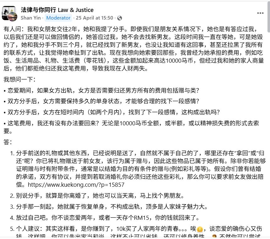 有一位网民在脸书群组《法律与你同行 Law & Justice》中投稿,并由群组的律师同时也是管理员代写及发布至群组。
